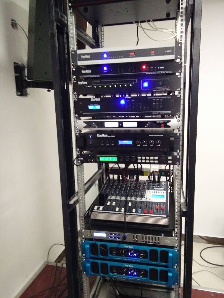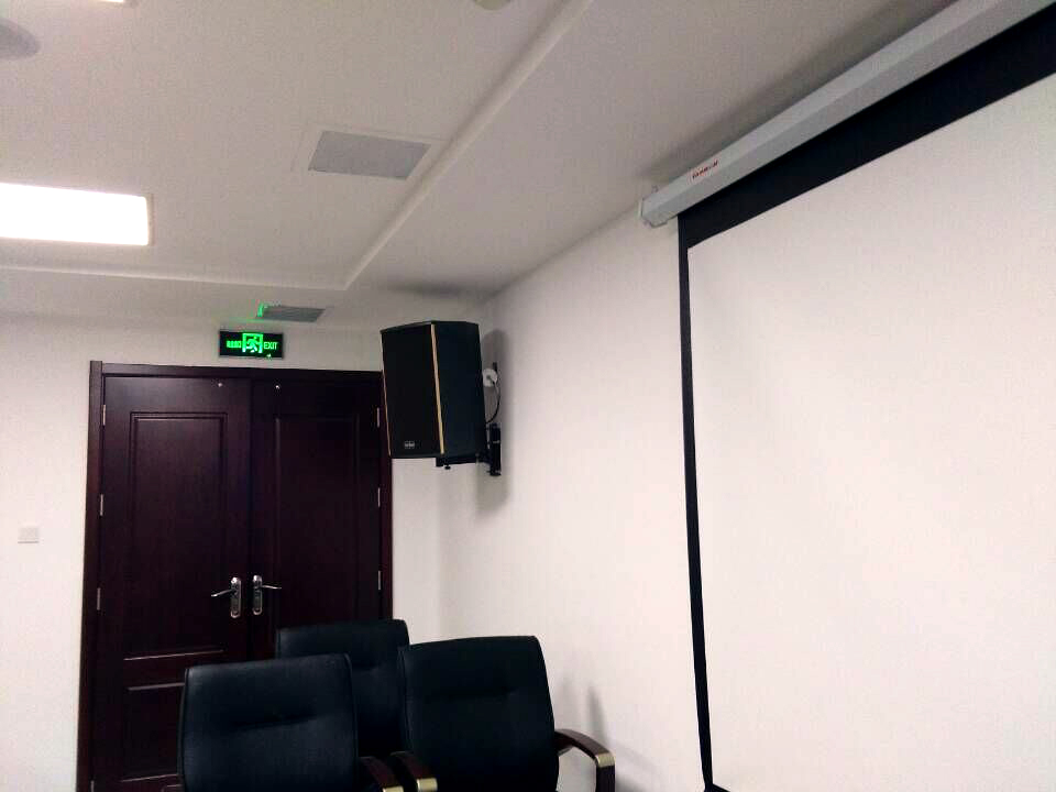 該項目中主擴揚聲器采用了兩只可調指向音箱壁掛的安裝方式,因此為了保證聲場均勻度達到廳堂擴聲系統聲學特性指標中的國家規定,京邦電子技術人員在調試過程中對兩只音箱進行了仔細的調整,將音箱指向調整到可以最佳,使得聲音可以均勻的覆蓋,另外對六只后場吸頂音箱加以延時、音量等處理,避免了聲像不統一的問題。